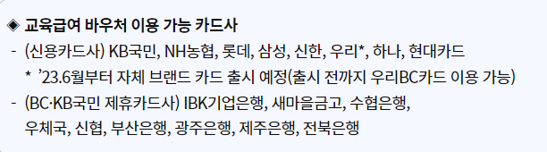 교육급여 바우처는 교육급여 수급권자(학생)의 다양한 교육활동을 지원하는 카드포인트 형태의 이용권(허용된 가맹점에서만 사용 가능)으로, 2023학년도부터 교육급여가 계좌이체가 아닌 바우처 형식으로 지급되고 있습니다.