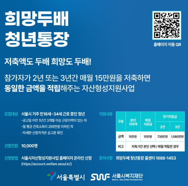 일하는 청년의 씨앗자금과 미래 설계를 지원하는 희망두배 청년통장은 일하는 청년이 매월 15만 원씩 2년 또는 3년간 꾸준히 저축하면 서울시 예산과 민간 재원으로 저축액의 100%를 추가로 적립해 주는 서울시 자산형성사업입니다.