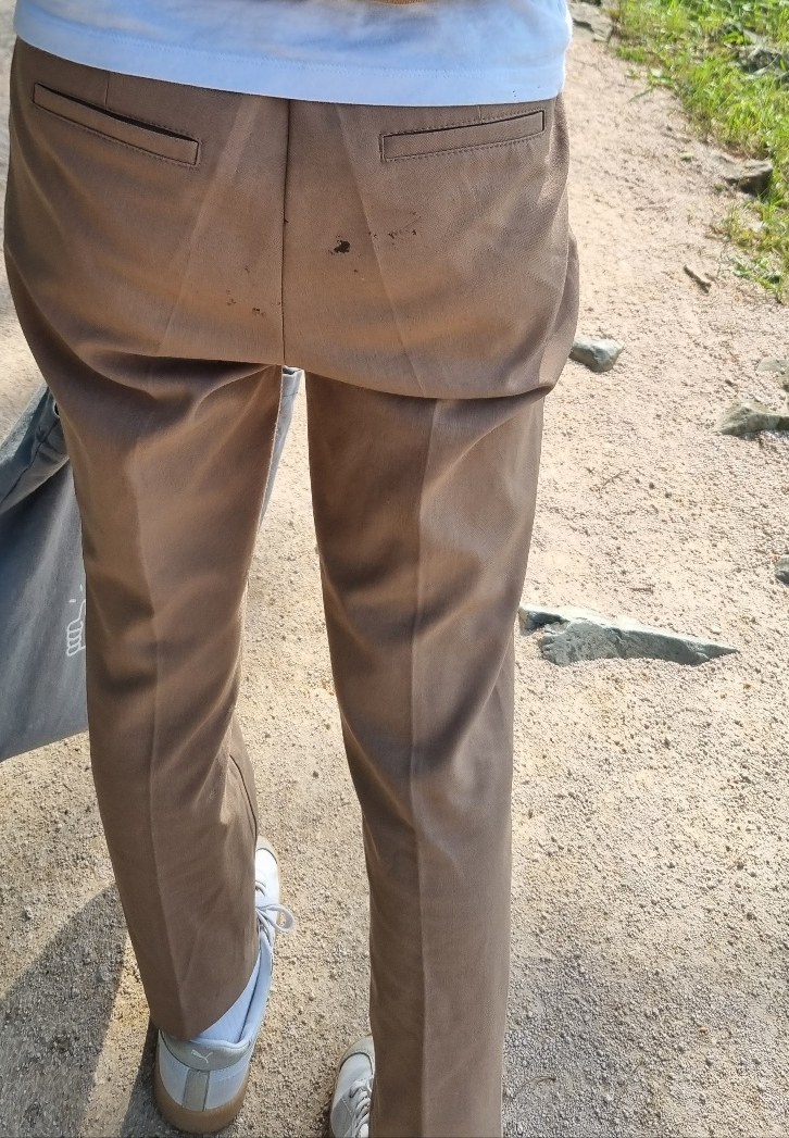 나들이 갔다가 피곤한 몸 잠깐 쉬기 위해 나무그루터기에 앉았다가 하필이면 바지 엉덩이 부분에 송진이 묻었어요.