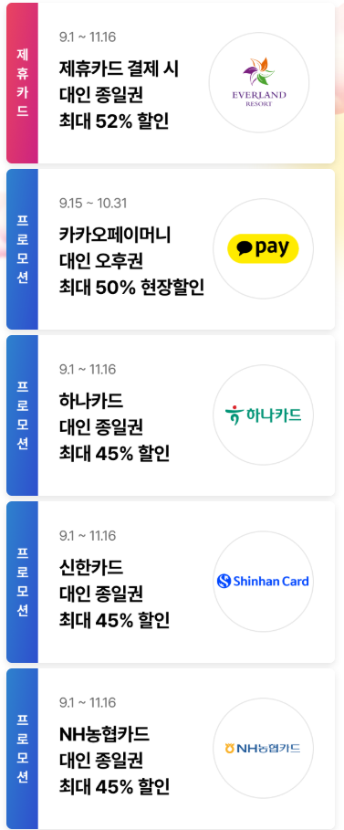 제휴 카드 본인 할인 종일권 50% 할인 또는 1+1 (시즌별 상이) 전월 실적 필수, 카드사별 일 1회 제한