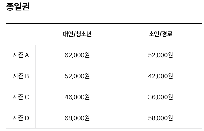 에버랜드 종일권 기본 운임 및 시즌별 가격