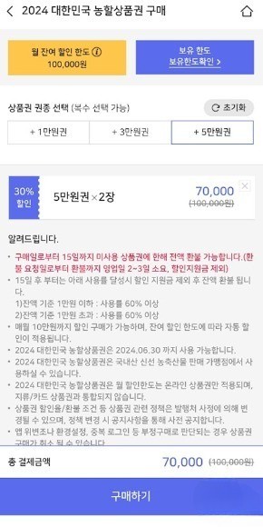 * 월 최대 구입금액인 10만 원을 클릭할 시 총 결제금액은 30% 할인된 70,000원 됨