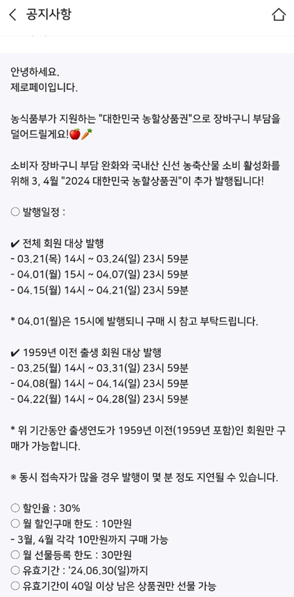 2단계 : 공지/이벤트의 '농식품부 할인지원 대한민국 농할상품권 추가발행' 클릭 후 월별 발행일정 확인