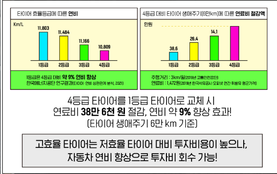타이어 생애주기를 6만 km로 봤을 때 4등급 타이어를 1등급 타이어로 교체하면 연료비를 38만 6천 원 절약할 수 있고 연비는 약 9% 향상됩니다.