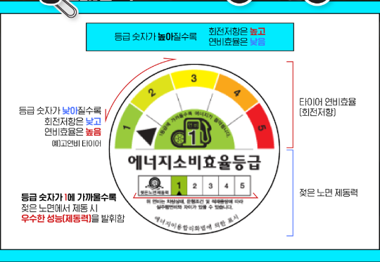 타이어 에너지소비효율등급제도란? 타이어의 회전저항(마찰력)과 젖은 노면 제동력을 측정하고 이를 기준으로 1등급부터 5등급까지 등급화한 제도입니다.