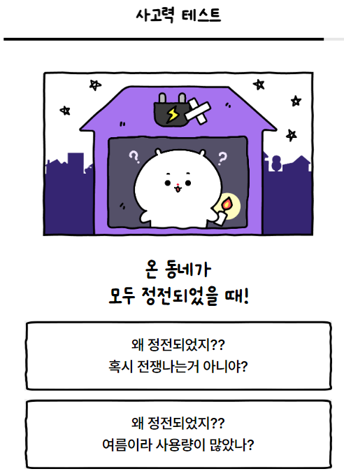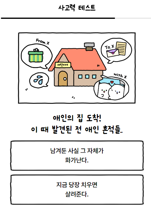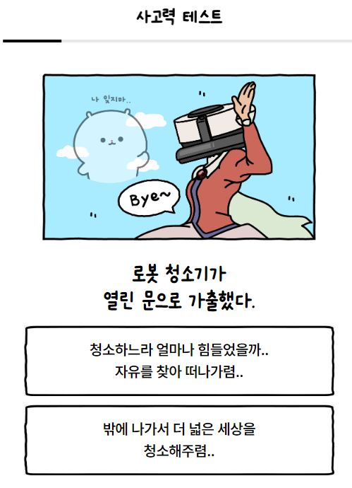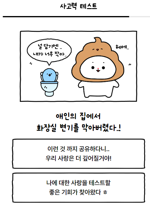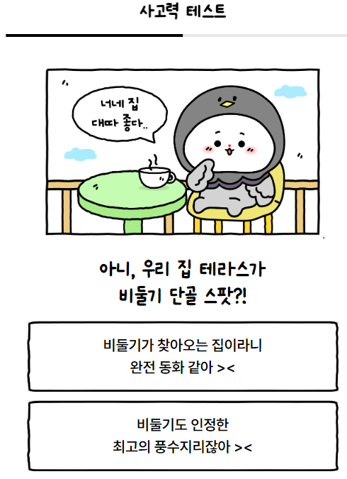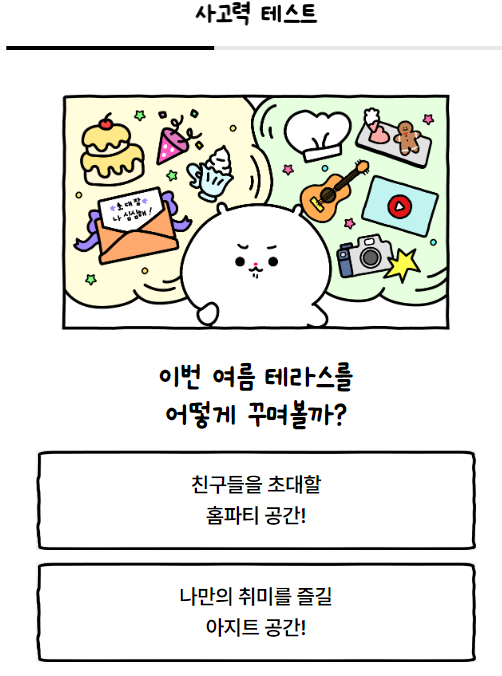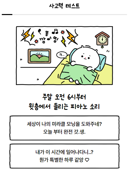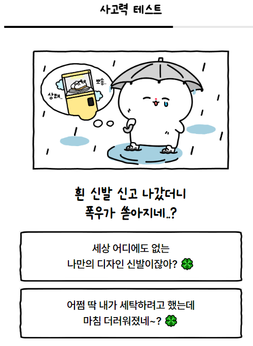 방구석 극한 상황 속에서도 럭키함을 잃지 않는 나의 사고력 테스트 바로 시작합니다. 테스트할 때마다 생각하지만 정답이 없는 곳에서 나에게 가장 가까운 답을 찾는 것도 쉽지 않은 것 같습니다. 그것도 두 가지 중에서 하나를 선택해야 하다니...