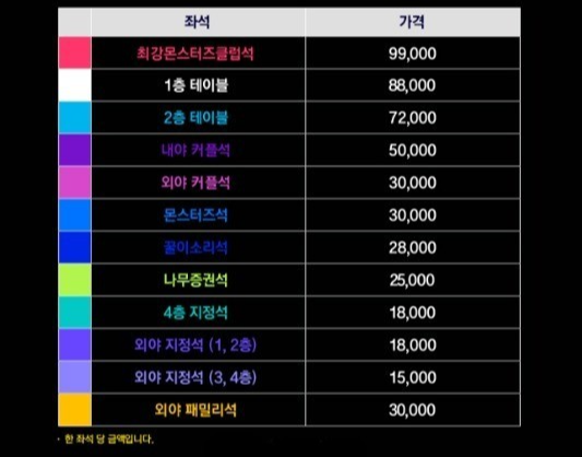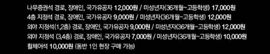 • 4층 지정석 경로, 장애인, 국가유공자 9,000원 / 미성년자(36개월~고등학생) 12,000원