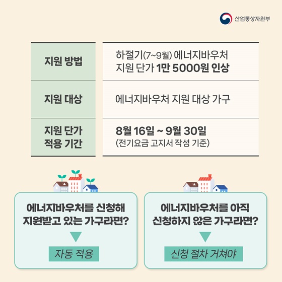 ● 지원 방법 : 하절기(7~9월) 에너지바우처 지원 단가 1만 5000원 인상