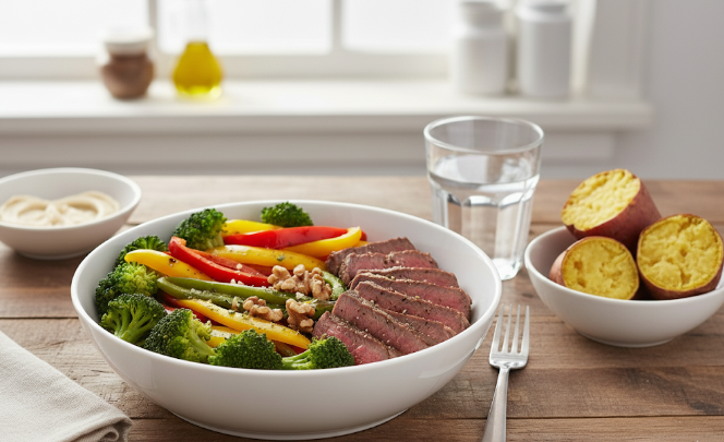 - 단백질 (30%): 소고기 우둔살 스테이크 (80g, 미리 구워 준비)