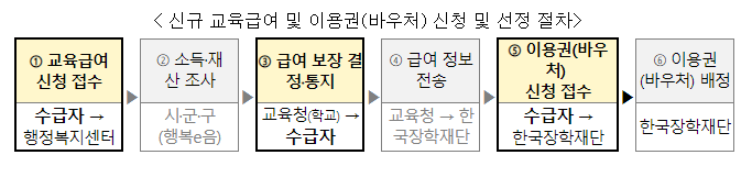 올해 신규로 교육급여 수급자로 확정된 학생, 보호자는 한국장학재단 누리집에서 이용권 신청을 별도로 해야 합니다. 교육급여 수급자로 확정된 경우 이용권 신청에 대해 학교와 한국장학재단에서 별도 안내(문자 등)를 할 예정입니다.