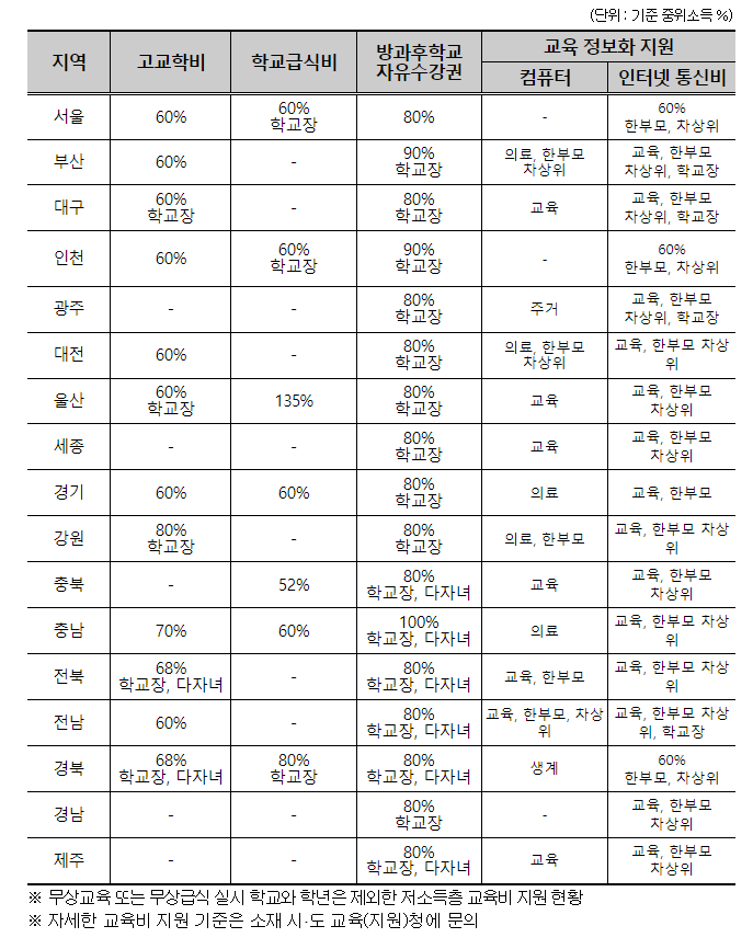 시도교육청별로 다름 ● 입학금, 수업료, 학교운영지원비 *교육급여 수급자는 학교운영지원비만 지원 ● 고교 교과서비 ● 급식비 ● 방과후학교 자유수강권(연 60만 원 내외) ● 교육정보화지원 등 (인터넷통신비 등 23만 원, PC지원) |