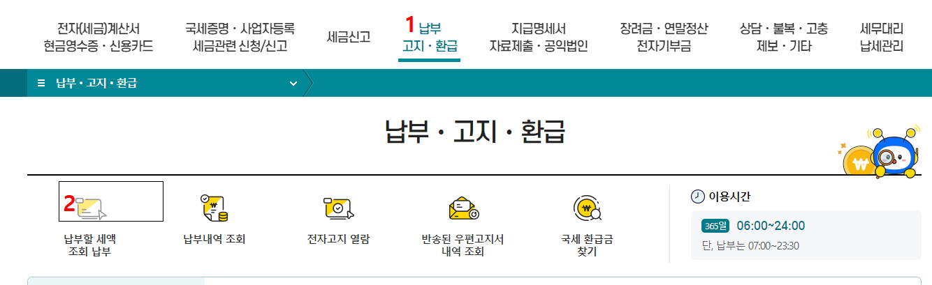 홈택스 로그인 후 상단 메뉴의 납부 고지. 환급  → 납부할 세액 조회 납부 클릭합니다.