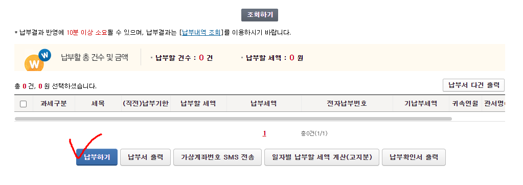 납부할 건 확인 후 납부하기 도는 납부서 출력 중 선택하여 클릭하여 납부합니다.