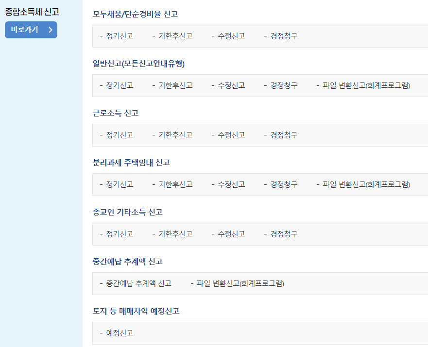 종합소득세신고 바로가기를 클릭하거나 옆에 나타는 신고종류를 선택하여 '정기신고'를 클릭합니다.