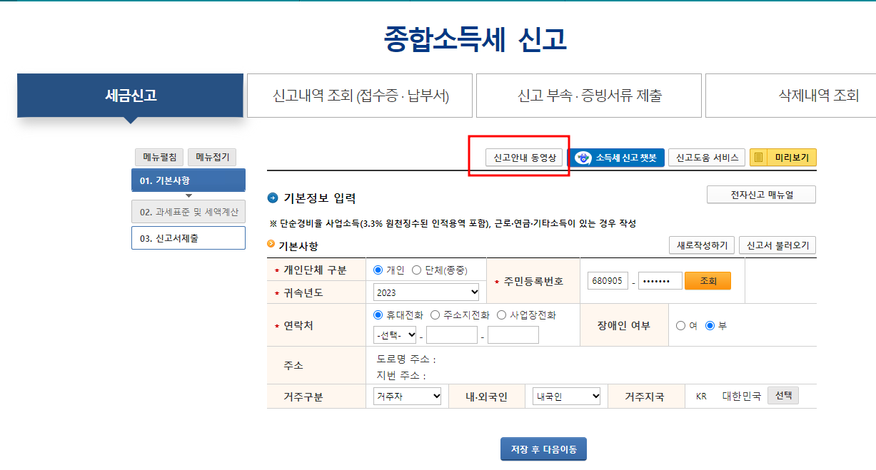 종합소득세 신고에서 기본사항을 확인하고 '저장 후 다음이동'을 클릭하여 순서대로 진행하면 됩니다.