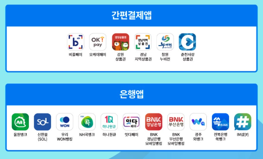 ● 간편결제앱 : 비플페이, 오케이페이, 강원상품권, 경남지역상품권, 창원누비전, 춘천사랑상품권