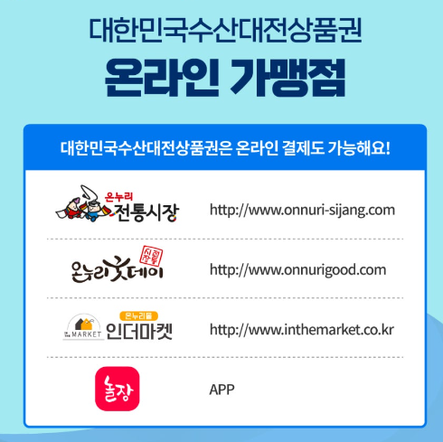 ● 온라인 가맹점 : 온누리전통시장, 온누리굿데이, 인어마켓, 놀장