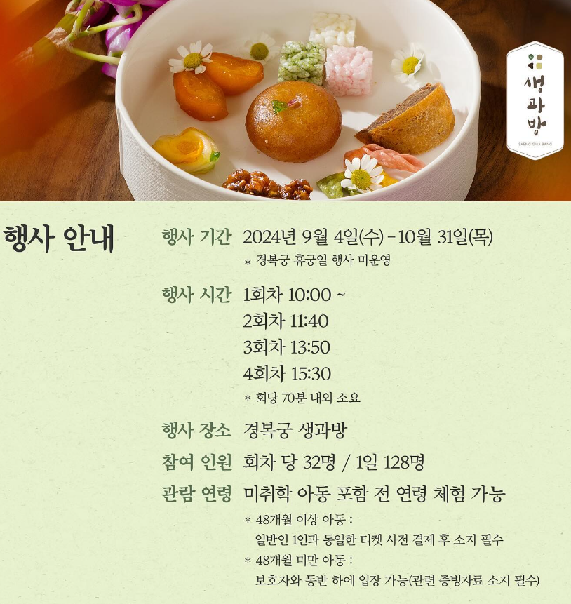 하반기 행사는 더 많은 이들에게 공정한 체험 기회를 제공하고기 위해 경복궁 생과방 예매권 응모에 참여 후 추첨을 통해 당첨된 분들만 예매에 참여할 수 있는 추첨제로 진행됩니다.