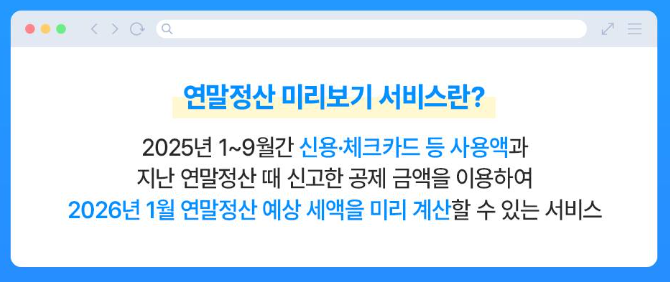 이 서비스는 2025년 1월부터 9월까지의 신용·체크카드 등 사용액과 지난 연말정산 때 신고했던 공제 금액을 바탕으로 내년 1월 연말정산의 예상 세액을 미리 계산해 볼 수 있어요. 덕분에 연말 소비 계획이나 저축 계획을 더욱 알뜰하게 세울 수 있죠.