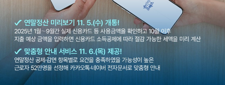 국세청은 2025년 11월 6일부터 내년 1월 31일까지, 연말정산 때 공제받은 이력은 없지만, 빅데이터 분석 결과 공제 대상에 해당할 가능성이 높은 근로자 약 52만 명에게 ‘맞춤형 안내’ 서비스를 제공하고 있어요.