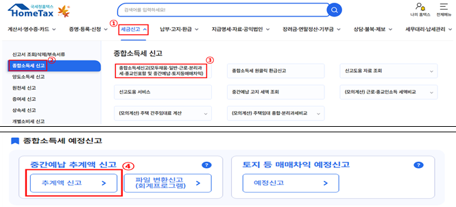 • 홈택스(PC): 로그인 > 세금신고 > 종합소득세 신고 > 중간예납 추계액 신고