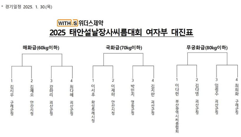 1월 30일(월) 여자부 대회결과 매화장사 최다혜(괴산군청), 국화장사 이재하(안산시청), 무궁화장사 이다현(부산광역시시름협회)가 등국하였습니다. 축하드립니다.