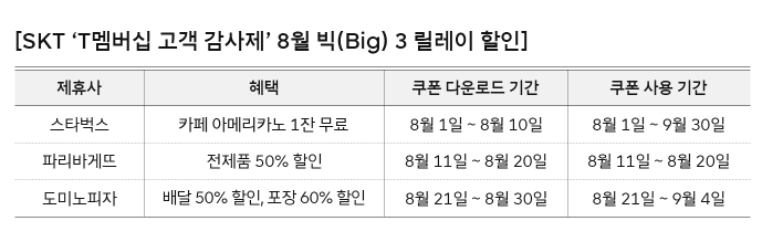 SKT 고객분들을 위한 정말 반가운 소식이 있어 자세히 알려드리겠습니다. SK텔레콤이 고객분들의 깊은 신뢰와 사랑에 보답하고자 특별한 'T멤버십 고객 감사제'를 시작한다고 합니다. 특히 8월에는 스타벅스, 파리바게뜨, 도미노피자에서 역대급 할인이 진행된다고 하니, 놓치지 마세요!